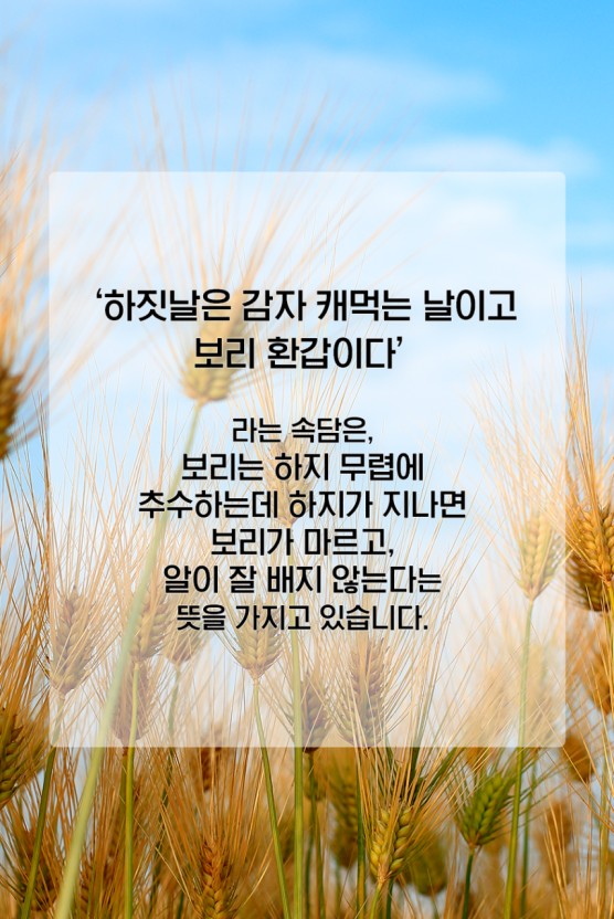 - 하짓날은 감자 캐먹는 날이고 보리 환갑입니다. : 보리 수확하기에는 늦었고 감자 수확하기에는 딱 좋은 시기라는 말인데요.
